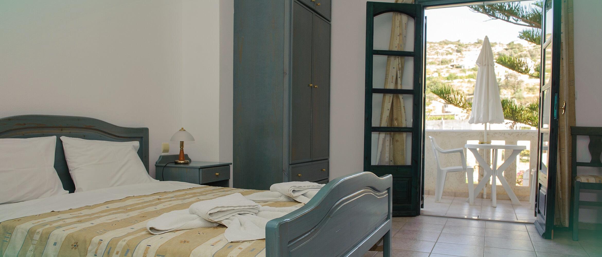 All rooms and apartments have balconies, with sea or mountain view. Breakfast, lunch, dinner as well as happenings are also available on request in our place. The fully organized and popular beach of Matala as well as the lonelly untouched beach of Komos are very close to our pension (4 and 1 km respectively).